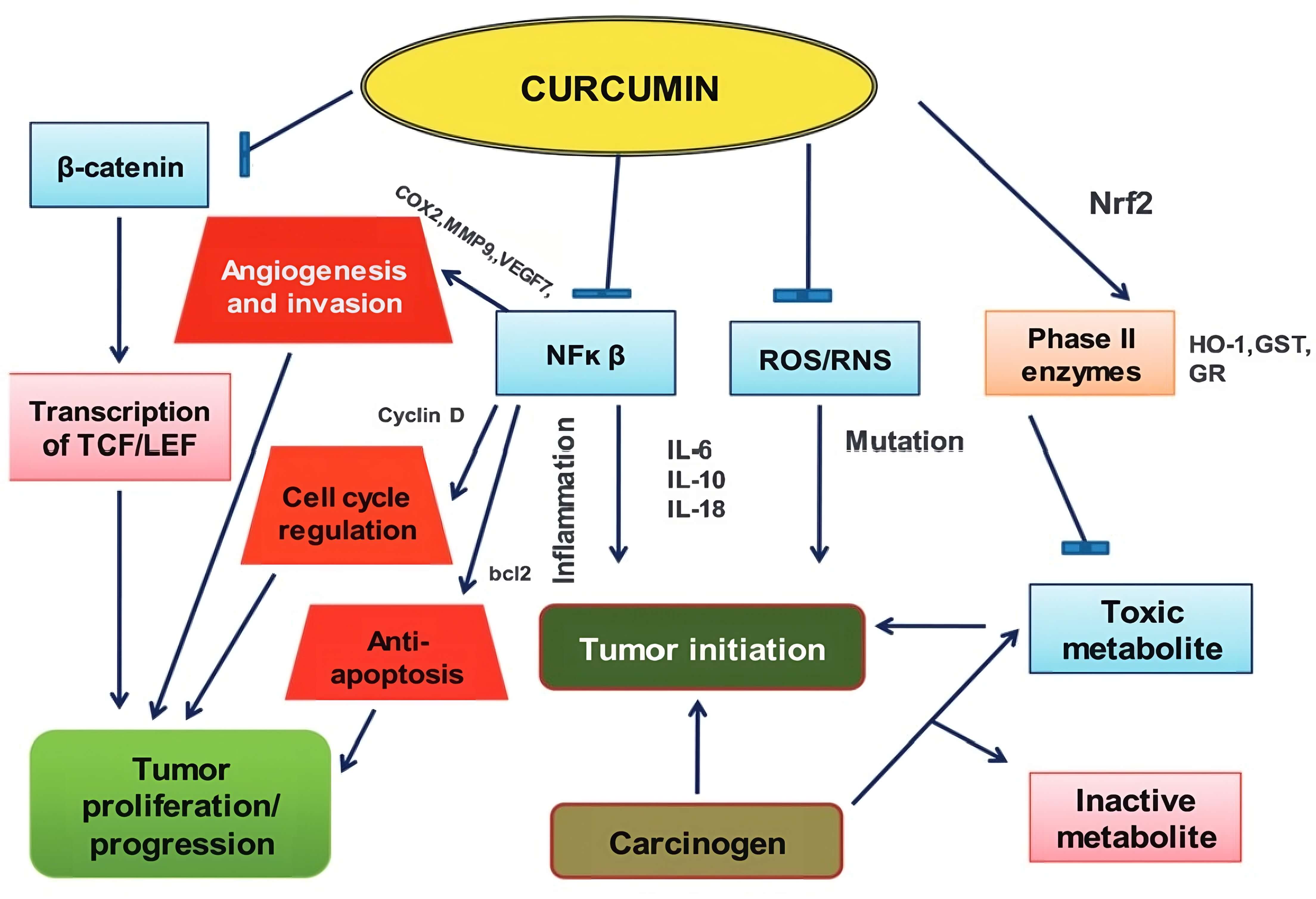 Datorită acestei capacități de a regla căile de semnalizare și țintele moleculare implicate în patogenia cancerului (factorii de creștere, enzimele, factorii de transcripție, kinazele, citokinele inflamatorii și proteinele proapoptotice și antiapoptotice), curcuminul poate suprima proliferarea celulelor canceroase, invazia, angiogeneza și metastaza într-o mulțime de tipuri de cancer.